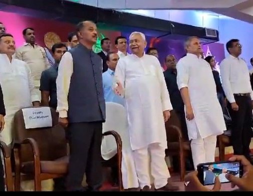फिर से राष्ट्रगान शुरू हुआ। इस दौरान नीतीश हाथ हिलाकर लोगों का अभिवादन करते रहे। जब प्रधान सचिव दीपक कुमार ने यह देखा तो उन्होंने हाथ देकर रोकना चाहा। उन्हें सावधान मुद्रा में रहने का इशारा किया, लेकिन वह तब भी नहीं माने और पत्रकारों की तरफ देखकर प्रणाम करने लगे।