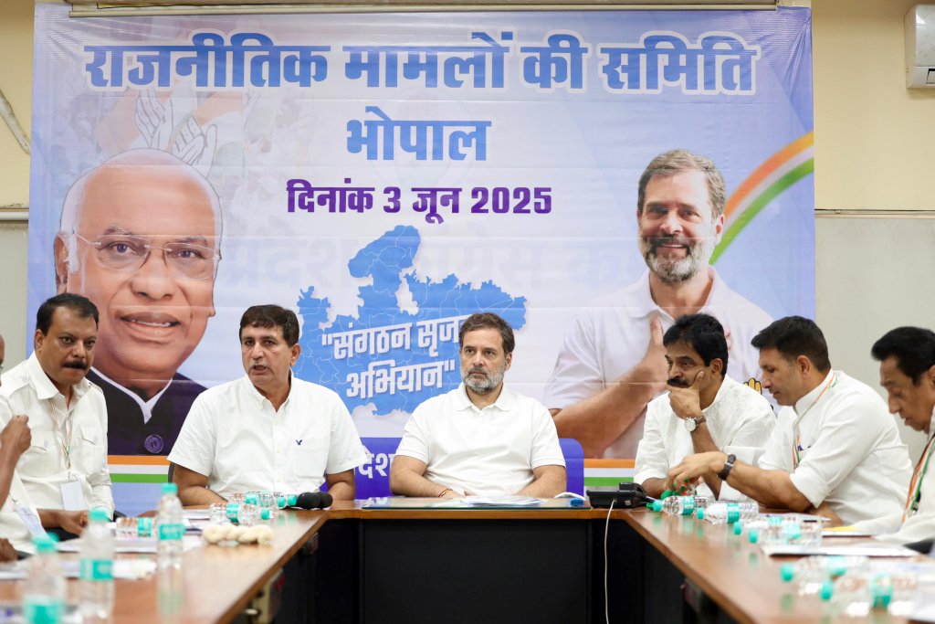 लोकसभा में नेता प्रतिपक्ष राहुल गांधी भोपाल स्थित पीसीसी दफ्तर में कांग्रेस की पॉलिटिकल अफेयर्स कमेटी (पीएसी) की बैठक ले रहे हैं। इसमें नकुलनाथ को छोड़कर अन्य मेंबर मौजूद हैं।