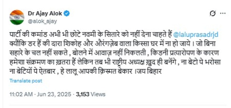बिहार की राजनीति में राष्ट्रीय जनता दल (RJD) के राष्ट्रीय अध्यक्ष के तौर पर लालू प्रसाद यादव की 13वीं बार निर्विरोध वापसी ने एक बार फिर सियासी गलियारों में चर्चा छेड़ दी है. RJD के राष्ट्रीय महासचिव अब्दुल बारी सिद्दीकी ने 22 जून 2025 को घोषणा की कि लालू ही पार्टी के राष्ट्रीय अध्यक्ष बने रहेंगे और सभी औपचारिकताएं पूरी हो चुकी हैं. 23 जून को लालू यादव ने नॉमिनेशन भी किया. इसको लेकर बीजेपी के राष्ट्रीय प्रवक्ता अजय आलोक ने तंज कसते हुए कहा, पार्टी की कमांड अभी भी छोटे नवीं के सितारे को नहीं देना चाहते, क्योंकि डर है कि दारा शिकोह और औरंगजेब वाला किस्सा घर में न हो जाए. अजय आलोक का यह बयान तेजस्वी यादव को RJD की कमान न सौंपने और लालू के नेतृत्व में बने रहने की स्थिति पर सवाल उठाता है. क्या यह लालू की मजबूरी है, रणनीति का हिस्सा या परिवार और पार्टी में बगावत का डर? क्या तेजस्वी को कमान सौंपने में कोई और राजनीतिक कारण है? यह सवाल बिहार की सियासत में 2025 के विधानसभा चुनाव से पहले अहम हो गया है.