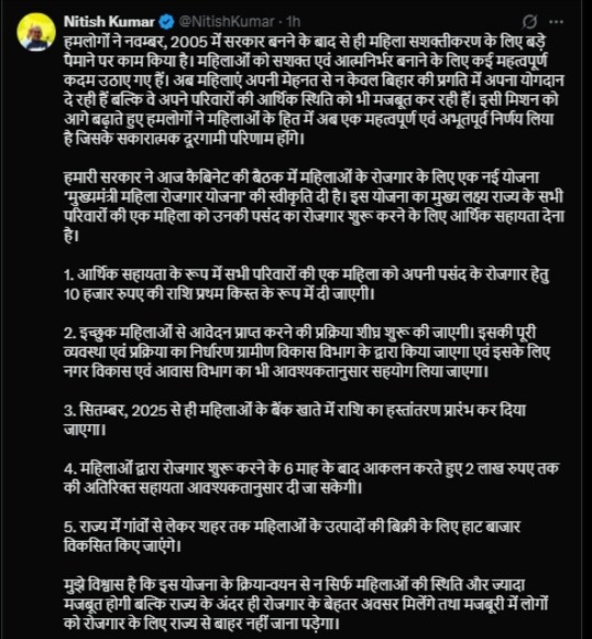 बिहार के मुख्यमंत्री नीतीश कुमार ने अपने एक्स अकाउंट (पूर्व में ट्विटर) पर महिला सशक्तिकरण को लेकर एक बड़ी घोषणा की। उन्होंने लिखा कि नवंबर 2005 में सरकार बनने के बाद से ही महिलाओं को सशक्त एवं आत्मनिर्भर बनाने के लिए लगातार प्रयास किए जा रहे हैं। अब महिलाएं अपनी मेहनत से न केवल राज्य के विकास में योगदान दे रही हैं, बल्कि अपने परिवार की आर्थिक स्थिति को भी मजबूत कर रही हैं।