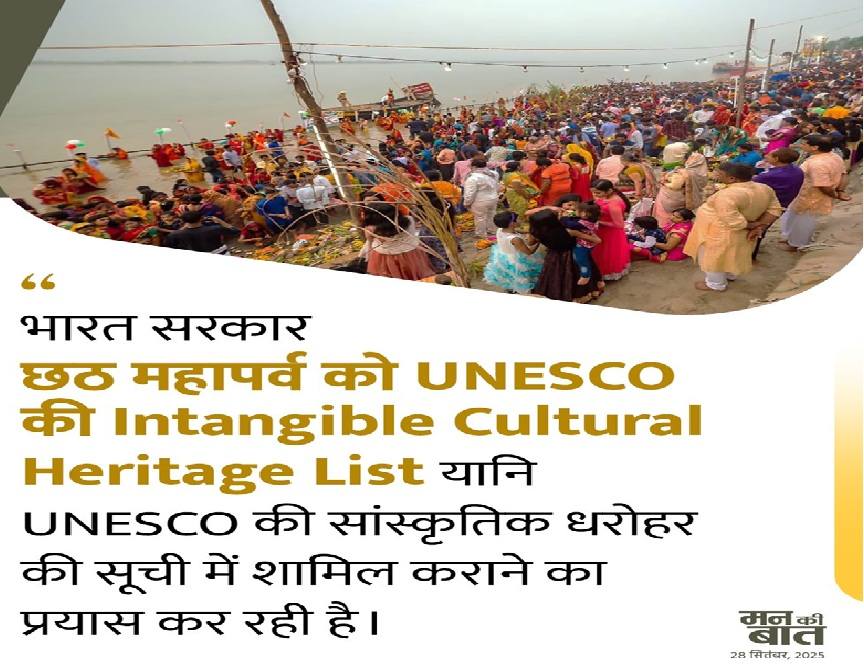 पीएम मोदी ने भारत की सांस्कृतिक विरासत को वैश्विक मंच पर ले जाने के संकल्प पर बात की। पीएम ने खुशी जताई कि भारत सरकार छठ महापर्व को UNESCO की अमूर्त सांस्कृतिक विरासत सूची (Intangible Cultural Heritage List) में शामिल कराने के लिए प्रयास कर रही है। उन्होंने कहा, “जब छठ पूजा UNESCO सूची में शामिल हो जाएगी, तो दुनिया के कोने-कोने में लोग इसकी भव्यता और दिव्यता का अनुभव कर पाएंगे।”
